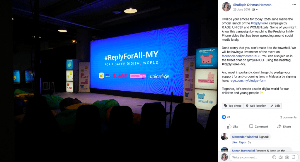 In 2017, I became UNICEF Malaysia’s Twitter content manager during their #SayaSayangSaya nationwide tour (a follow-up to the Malaysian chapter of the global UNICEF campaign #ReplyForAll) against child grooming. The campaign is a collaboration between UNICEF Malaysia, Digi, and WOMEN:girls. This initiative led to the cabinet approval of the Child Sexual Crimes Bill 2017.